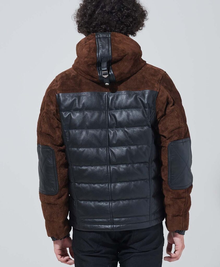 こちらもレザーダウンでスリムフィットの雰囲気あるバイカー風防寒ジャケットです。
